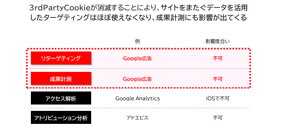 サードパーティークッキーが廃止されると、企業は今まで行ってきた広告効果の測定やターゲティング広告の実施が困難になるため、デジタルマーケティング活動において大きな変更が必要となります。