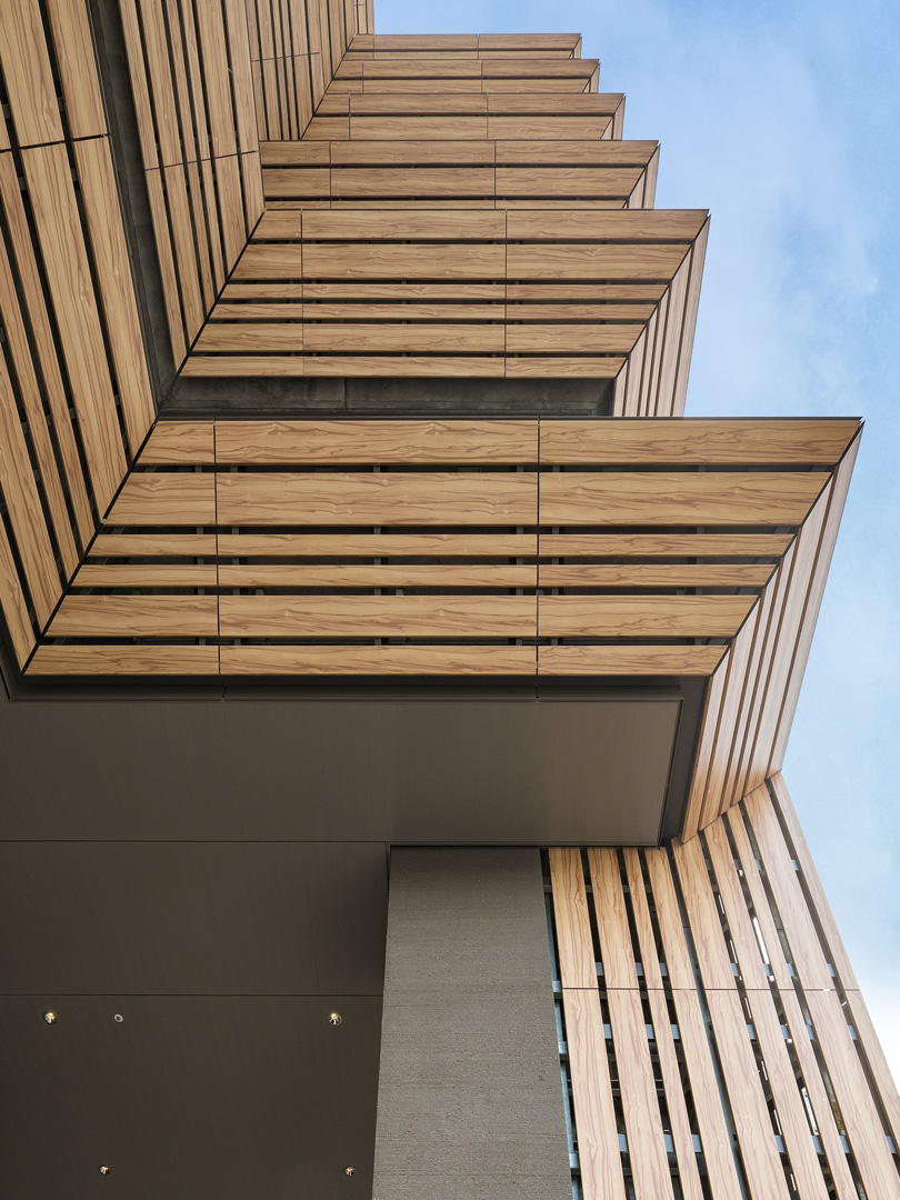 建物に近づいて「木目」の部分をよく見ても、天然木の表情や質感を感じられ、一見アルミパネルには見えません。色は、濃いグレーの外壁から少し浮き立つような、薄い茶で統一。長手方向に濃い茶色の木目が入っており、隣り合う材料で木目の模様が続いています。通りゆく人も不思議に感じるのか、パネルを直に触っている姿が見受けられました。