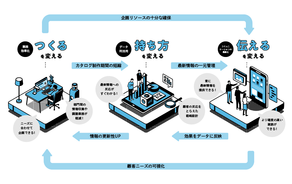 そのため、「正確なカタログ」づくりにおいてDXを活用した制作プロセスの変革を行い、「魅力あるカタログ」づくりのためのリソースを生み出すとともに、これまでよりも顧客体験価値を高める取組みによる課題解決が必要です。