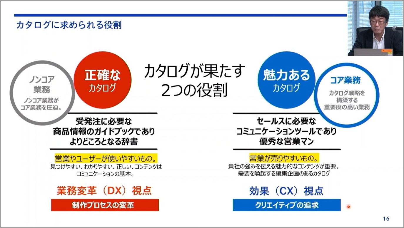 カタログ制作では、正確な情報が載っている「正確なカタログ」であり、またそれ自体が営業マンとして戦略的に機能する「魅力あるカタログ」でもあるという、2つの役割を果たすことが求められます。しかし、現実にはそのバランスは崩れ、「正確なカタログ」づくりに追われ「魅力あるカタログ」づくりにリソースをかけられていない企業が多いと指摘しました。