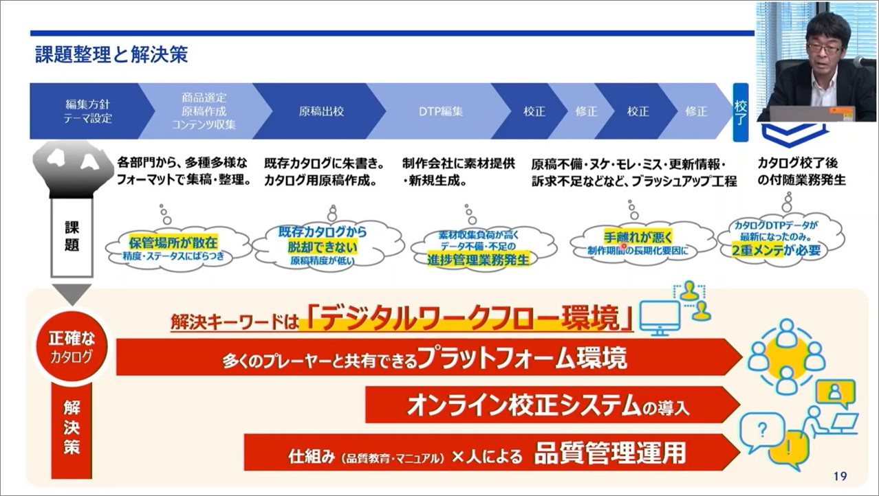 「正確なカタログ」づくりでは、制作プロセスの中でいくつもの課題が散在している状況が多く見受けられます。そこで、3つの施策によりデジタルワークフローを構築することが解決策となり、トレンドであると紹介しました。