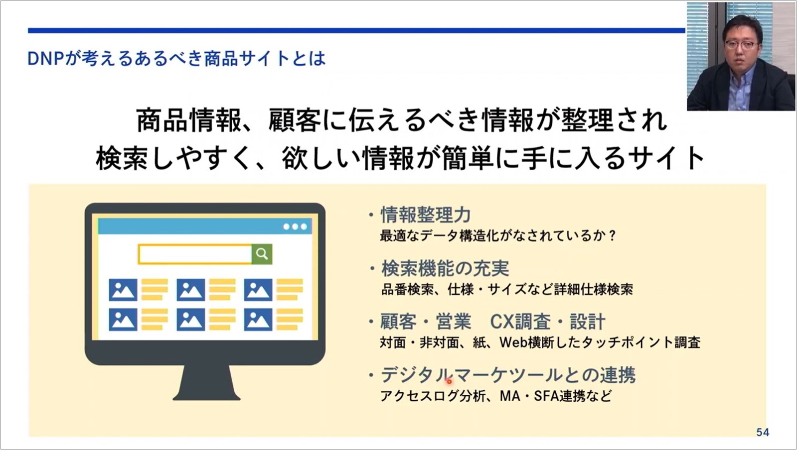 カタログデジタル化のうち、一つの答えとして「製品サイト化」というものがあります。ここでは、DNPが考える「あるべき製品サイト」とはどういったものか、「こんなサイトは機能していない」という視点から紹介しました。