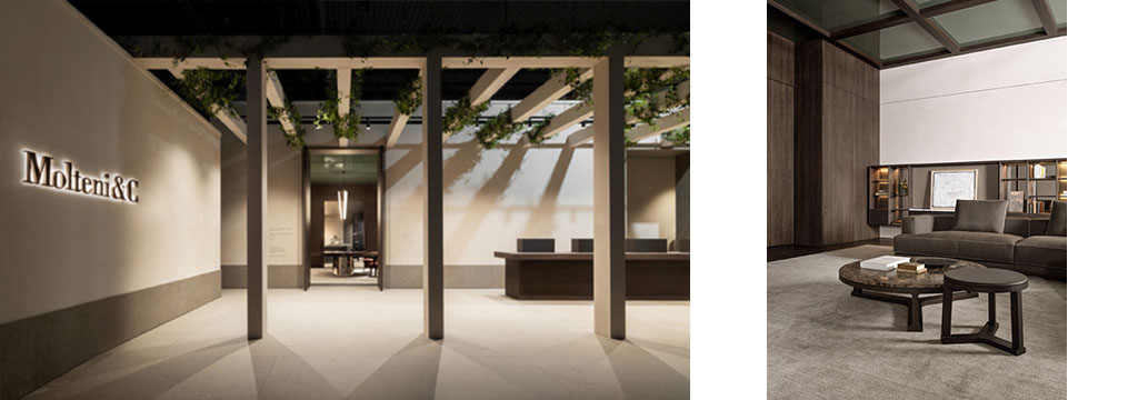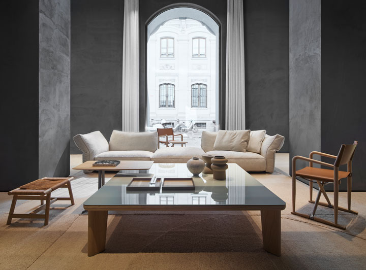 Salone del Mobile.Milanoの会場(画像左)では、Between the Foldsをテーマに、美しいギャラリーや舞台セットを想わせる展示が行われました。ホワイトをベースにした空間に、木質のあたたかみが際立ち、クワイエットラグジュアリーを表現していました。ミラノ市内のショールームでは、会場に展示されていた新作を実際に手に触れて試すことができます(画像右) 。