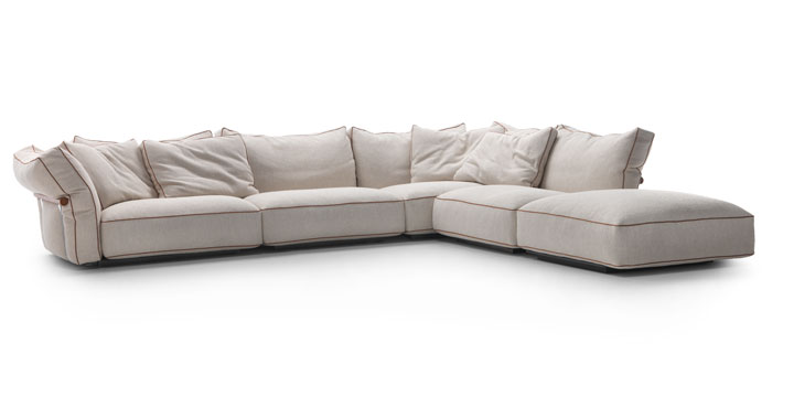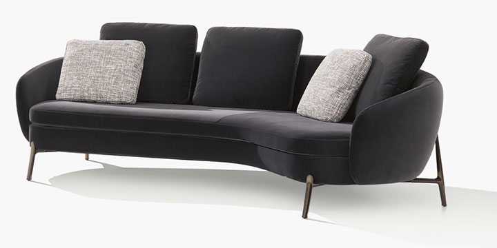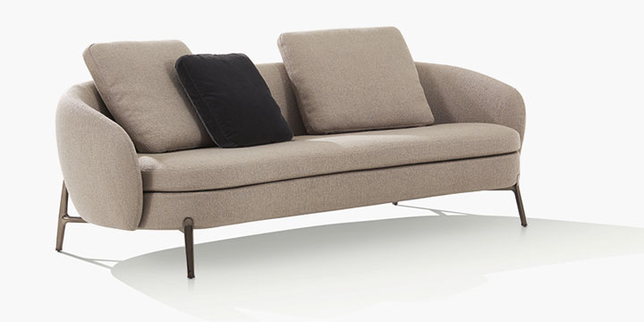 画像左はAntonio Citterioデザインによる新作ソファ CAMELOTです。側面にメタル製のフレームとウッドまたはレザー張りの円筒形バーが設えられていて、視覚的なアクセントになっています。ファブリックの柔らかさとバーのコントラストがユニークなデザインです。バックレストクッションは、大きく包み込むような感触のグースダウンが使用されています。