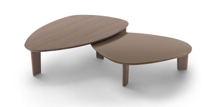 画像右は同じくAntonio Citterioデザインによる新作コーヒー・サイドテーブル ARNOLDです。オークとカナレットウォールナットのナチュラル感を強く表現した仕上げは、今年新しく加わったマテリアルです。思わず触ってみたくなるような質感で、素材のあたたかみを感じます。 ARNOLDはダイニングテーブルのシリーズも展開されています。
