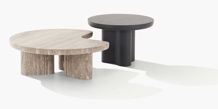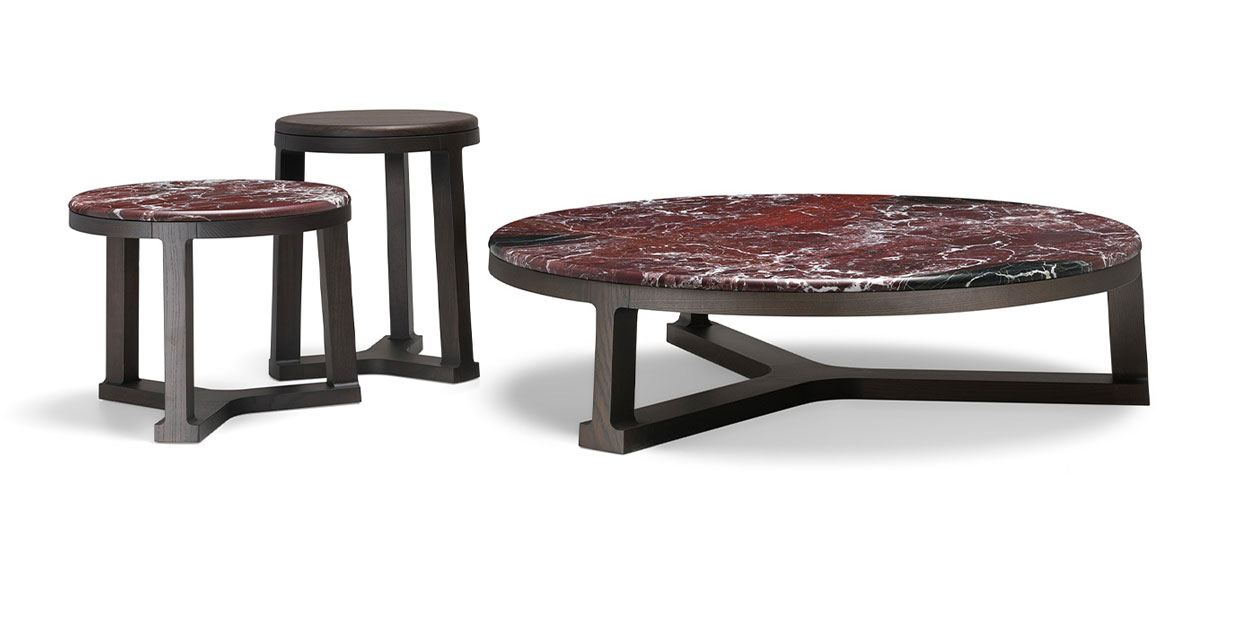 コーヒーテーブル、ラウンジテーブル、ベッドサイドテーブルの3つの用途に対応したFonte。ブランドのクラフツマンシップを表現した無垢のオーク材を使用した脚部や細部のこだわり、さまざまな用途に対応する機能性がどんなインテリアも美しくまとめ上げます。さまざまな天板の仕上げも特徴で、Salone del Mobileの会場ではグリーンやレッドの大理石のバリエーションが空間を鮮やかに彩りました。