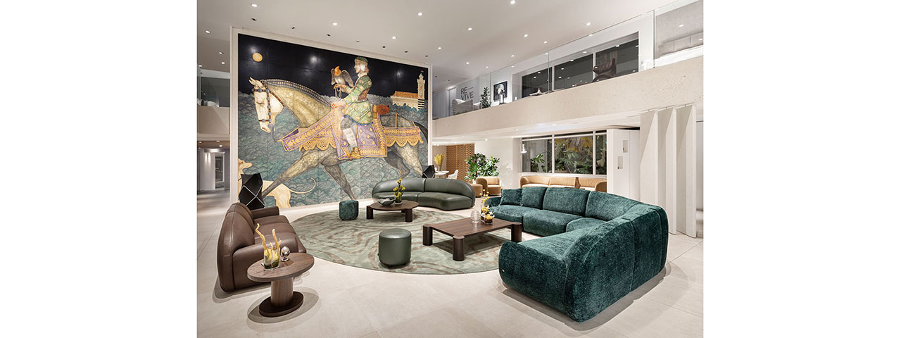 創業65周年を記念し、 “quiet luxury“をテーマにしたショールームがお披露目されました。ミラノ市内のショールーム内、中心に位置する吹き抜けには、Natuzzi Italiaの創業の地であるプーリア地方を治めていたフレデリック2世を描いた高さ8mにも及ぶGino Donvitoのアート作品「Puer Apuliae」が飾られています。この作品の前には、アートから引き出されたカラーが採用されたソファがコーディネートされ、空間全体が絵画の中に惹きこまれるような感覚がありました。