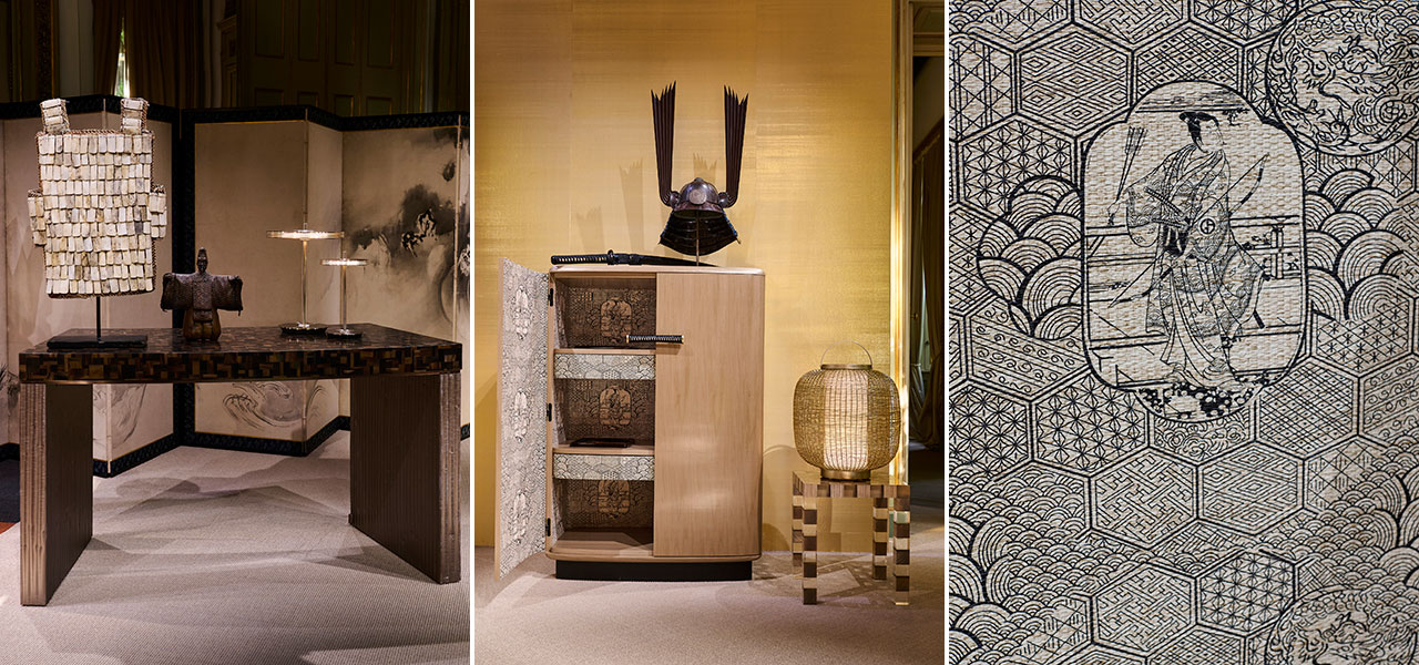 日本の映画「影武者」からインスピレーションを得たコレクションの一部であるドレスとともに展示されたのは、キャビネット「VIRTÙ(ヴェルテュ)」(画像中央)。刀にインスパイアされたハンドル、そして扉を開くと内側のグラフィックの中にアルマーニのロゴが家紋のように取り入れられていて、遊び心を感じさせます(画像右) 。
