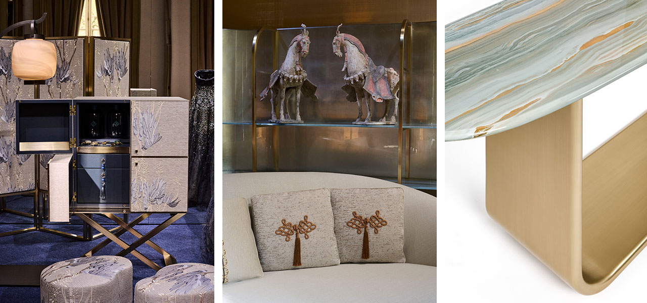砂漠の夜景やアラビアンナイトの雰囲気からインスピレーションを得たのは、ブルーのレザーインテリアのバーキャビネット「CLUB(クラブ)」(画像左)。植物をモチーフにした刺繍が施されたグログラン生地のスクリーンが非常に美しく、ファッションとの融合を感じさせます。画像中央は中国からインスピレーションを受けたエリアで、鏡の回廊の中で繊細な金の色合いが表現されていました。有機的なフォルムのソファ「VISO(ヴィーゾ)」を囲むように展示されたコンソール「VENUS(ヴィーナス)」と書棚「VIRGOLA(ヴィルゴラ)」。天板・棚板に使われているOrsini Glassは金箔を貼った上から塗装を施し、独特の模様が空間を美しく彩っていました(画像右)。