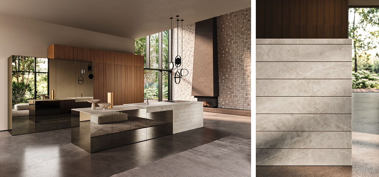 Orlando Designによるキッチン「Elementi」は、アイランド部分が今年の新作です。クオーツタイルを重ねた土台のデザインは、タイルの数によって高さを調整することができます。空間を華やかに反射している面材「PVD Mirrored Amalfi」は、今年の新しい仕上げ。アルミボードに特殊な加工を施したミラーのようなマテリアルですが、このように大きなサイズのマテリアルを作り出せるのはSnaidero独自の技術ならでは、とのこと。リブ加工されたヨーロピアンウォールナットとのコントラストが際立ち、シンプルな構成でありながら高いデザイン性を感じます。