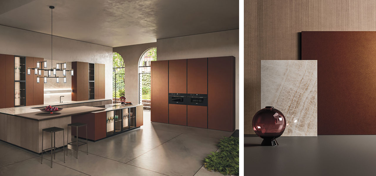 Snaidero Designによるキッチン「Way」は、厳密なプロポーションとシンプルな直線で構成され、扉の薄さが際立っています。扉の仕上げに新たに加わったFiorentino Red Lacqueredは、メタルパウダーを吹きかけてから、表面を研磨する独自の技術で作られたもので、見る角度によってゴールドやブラウンに色が変化する特殊な加工が施されています。天板は吸水しにくいブラジル産の大理石が使用されています。