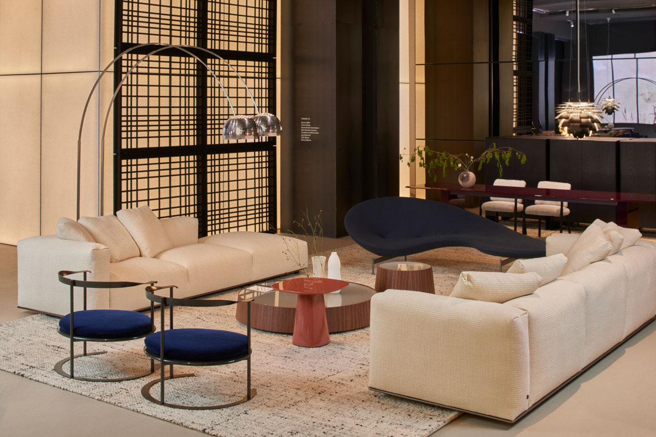 B&B Italiaは、新作だけでなく時代を超えたデザインの軌跡をたどり、歴史的なコレクションの価値を呼び起こすアンソロジーを発表しました。画像左のソファは、Piero Lissoniデザインの新作Dambodueです。存在感がありながら控えめでもあり、静けさとエレガントさを兼ね備えたデザインです。中央には、Monica Armaniデザインの新作スモールテーブルAllure O‘ Dotと2022年に発表されたPiero LissoniデザインのPlanckがコーディネートされ、空間に華やかさをプラスしています。