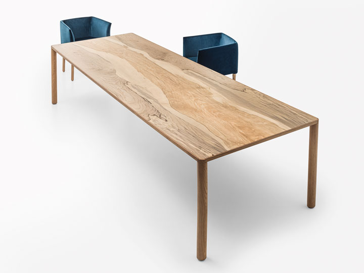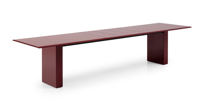 ショールームの中で存在感を放っていたPiero Lissoniによる新作テーブルを2つご紹介します。画像左の Isosは、テーブルの脚のデザインが特徴で、天板との接触部分が35度にカットされています。まるで鉛筆のようなフォルムで、軽やかに天板を支えています。画像右のAssialeは伸長式と固定式の2つのバージョンがあります。さまざまな仕上げが用意されていますが、ミラノのショールームでは赤の鏡面仕上げのテーブルがコーディネートされ、空間のアクセントになっていました。