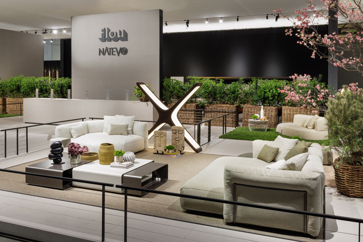 広い空間、独創性、パーソナライズなどの受容に答えた2024年コレクションを象徴するように、Flouは新作家具をNatevoのプロダクトとともにSalone del Mobileの解放感のある広々とした会場で発表。Pinuccio BorgonovoのデザインによるシーティングシステムFioccoは、7つのシートモジュール、2つのアームレストモジュール、1つのバックレストモジュールを組み合わせ可能な形にアップデートされ、インテリアを型にはまらないモダンな方法で演出します。屋内向け、屋外向け仕様で展開されており、モジュールの間にFoglioテーブルを追加することで多な使用シーンに対応が可能です。