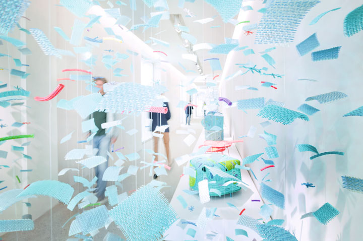 ショールームのエントランスを色鮮やかに彩っていたのは、nendoによる新コレクション “花嵐 Hana-arashi “。Mottainai Projectの第2弾として、アームチェアやプーフなどが発表されました。