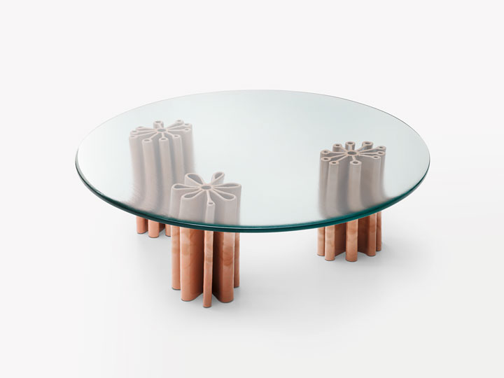 画像左は新作アウトドアコレクションからNicolò MoralesデザインのサイドテーブルPrimulaです。花の形をしたマヨリカ焼きのベースが特徴で、Nicolò Moralesが手作業で彩色しています。画像右はインテリアコレクションの新作から、F. RotaデザインのダイニングテーブルElonです。天板はAbonos™ アッシュ材で仕上げとなっており、木質の大胆なテクスチャーを楽しむことができます。Abonos™は、数千年ものあいだ川底に埋められ、化石化のプロセスが促進した木材を再利用したもので、高い耐久性のあるサステナブルな素材です。