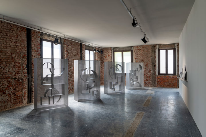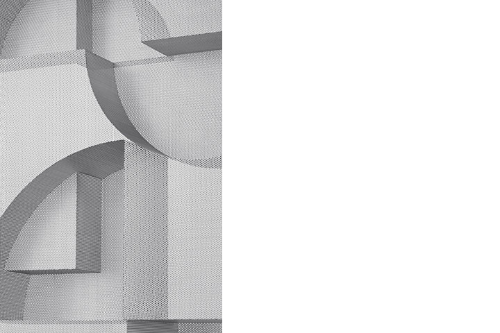 clustered clouds は空に漂う雲から着想を得たシェルフのコレクションです。無数の穴からなるパンチングメタルを素材に用いることで、雲のイメージである「空っぽの質量」を表現しています。シェルフを中心に一周ぐるりと回ると、複雑に重なり合うパンチングメタルが次々と表情を変えます。一瞬一瞬で姿を変える、雲のイメージそのものを感じさせるコレクションとなっていました。