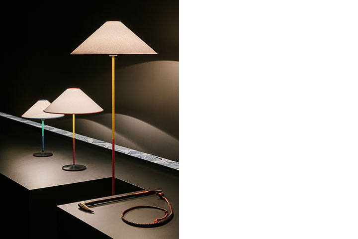 画像左はモダニズムの伝統を受け継ぐラウンジチェア 《ディアパゾン・ドゥ・エルメス》です。力強いフォーマルなデザインを形作る素材とのコントラストが美しいチェアです。画像中央はランプ 《ヴォルティージュ・ドゥ・エルメス》。ランジング用の手綱、短鞭、障害競技のポールからインスピレーションを得ています。バイカラーのレザーを編み込んだ細い支柱、スラブリネンのランプシェードにはレザーのパイピング、パティネ加工が施されたブロンズのような質感の台座で構成されています。控え目でありながら、カラーとマテリアルのコントラストが効いたユニークなデザインです。