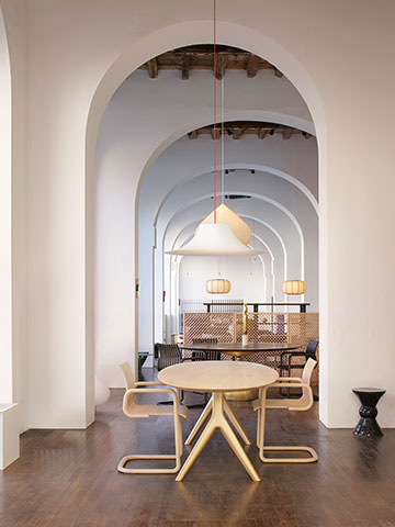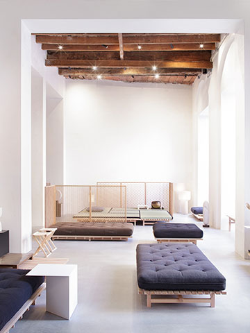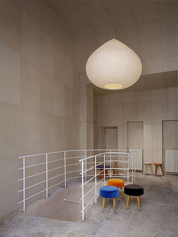 Time & Styleは既存のTime & Style San Marcoに隣接する新しいショールームを2つオープンしました(画像左・中央)。画像左は新作のStone Garden とKumiko Partition です。Stone Gardenは京間の畳のサイズを基本とし、畳や布団といった日本のエレメントで構成された新しいモデュール家具の提案です。通常のソファにあるバックレストをなくしてみることで、空間の景色が水平方向に広がります。またクッションパーツは日本の布団をイメージし、京都の老舗布団メーカーと協力して開発しています。Kumiko Partitionは良質な杉材を使用しフレームを極限まで細くし、組子紋様の美しさを際立たせるシンプルなデザインです。金物を使わずに製作された紐丁番により、表裏自在に可動する折りたたみ部分が特徴です。イタリアンモダンデザインに溢れたミラノデザインウィークの中で、日本の美しい感性をモダンに表現したプロダクトとして注目を集めていました。