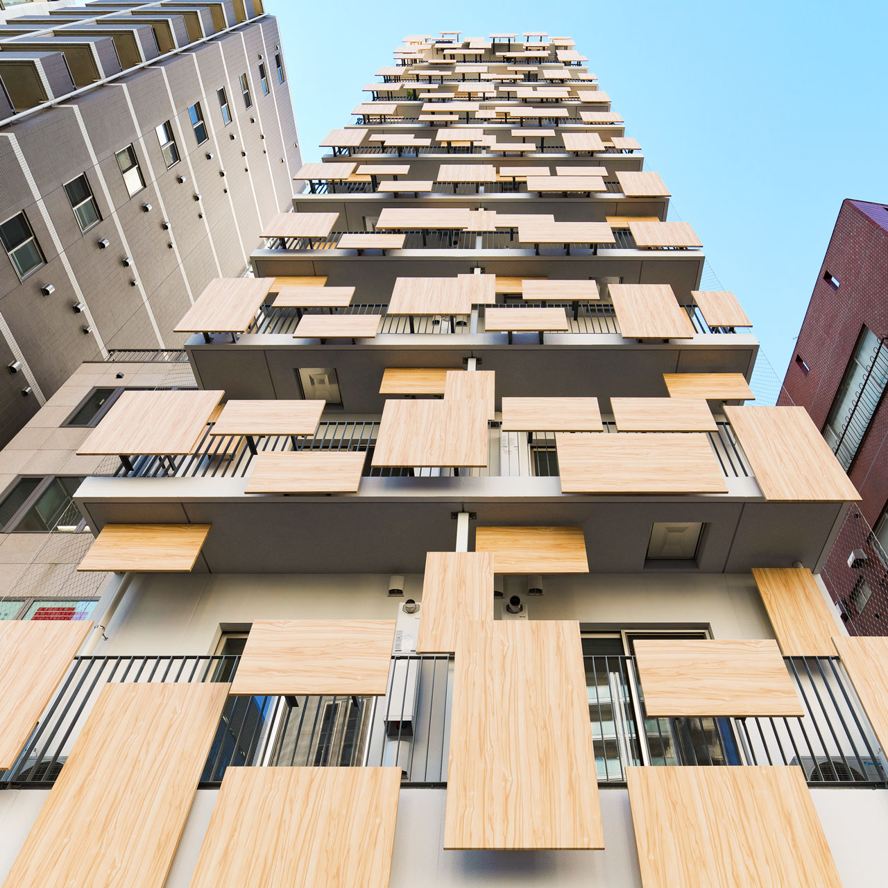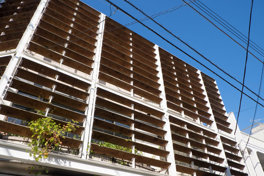 U:up四ツ谷でアートテックが使用されているのは、外観にランダムに配置されたパネル部分です。外観のデザイン性を高めるだけでなく、木漏れ日の効果により、穏やかな室内環境を生み出すことにも貢献しています。自然な雰囲気を持った木目柄を用いることで、コンクリートや鉄筋でできたビルにはない温かみを演出し、建物を見た人に安らぎを与える効果もあります。