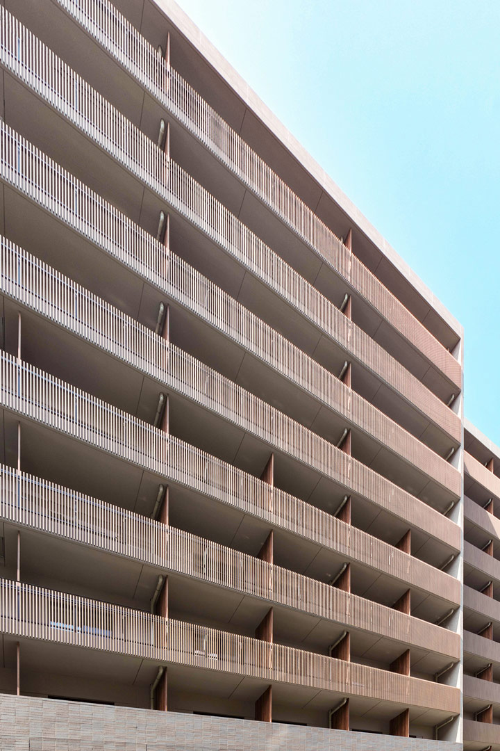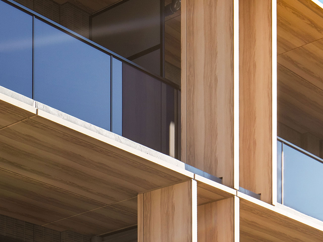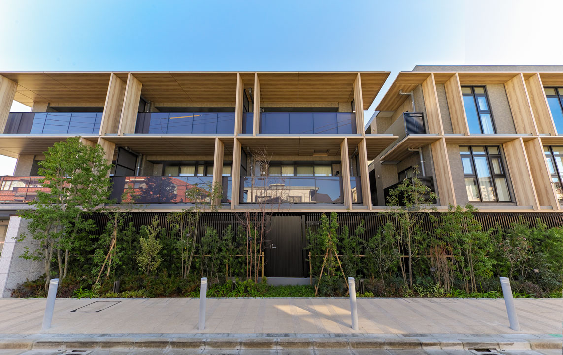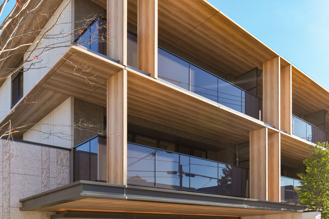 グランリビオ浜田山では、バルコニーのマリオンと軒天にアートテックが使用されています。木目柄にデザインされたアートテックを用いることで、周囲の自然と調和した上質な空間を演出しています。