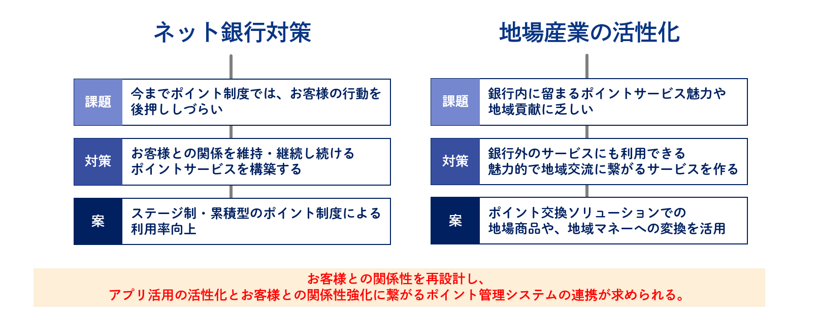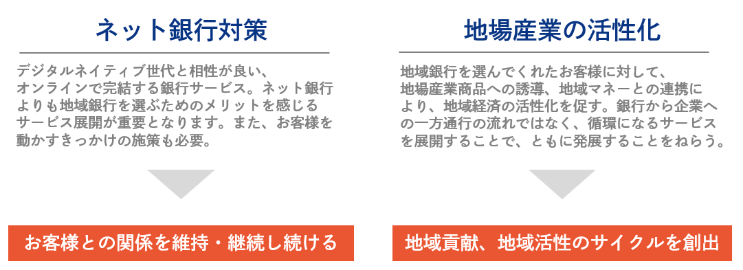 今回の「ネット銀行対策」と「地場産業の活性化」という点で考えると、ネット銀行に流れないための関係性の維持や利便性の向上に向けた施策や、たまったポイントを地場商品や地域マネーへの交換なども検討し、アプリなどを活用し関係性の強化を行えるポイント管理システムが求められます。