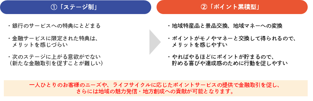 今まで多かったポイントプログラムでは「ステージ制」の手数料や金利の優遇にとどまっていました。また「ポイント累計型」のサービスを提供していても「お客さま一人ひとりの行動やライフサイクルまで管理することを想定したシステムを導入されていないことが多くありました。地域のお客さまとの関係性を改めて金融業から相談役に再設計し、地場産業との連携で地域創生を促すためにも「顧客管理を含めたポイント管理システム」は有効な施策です。