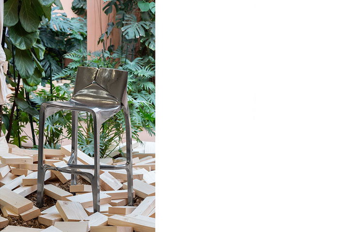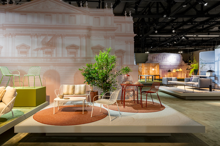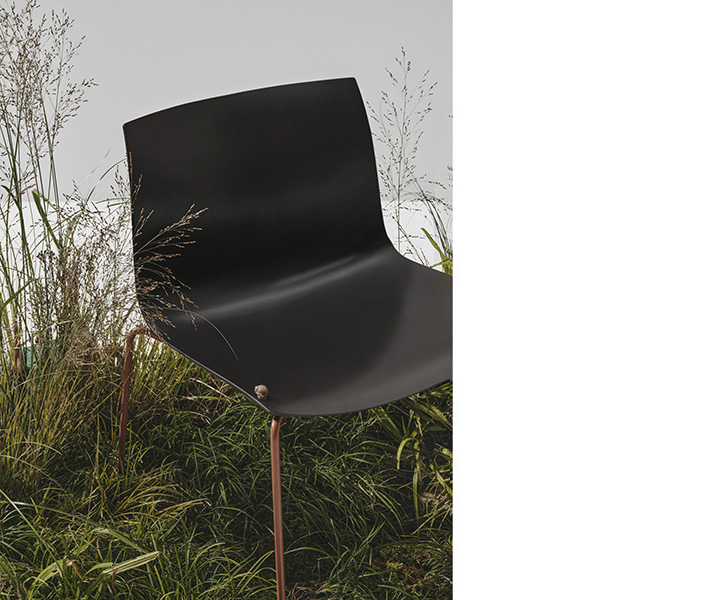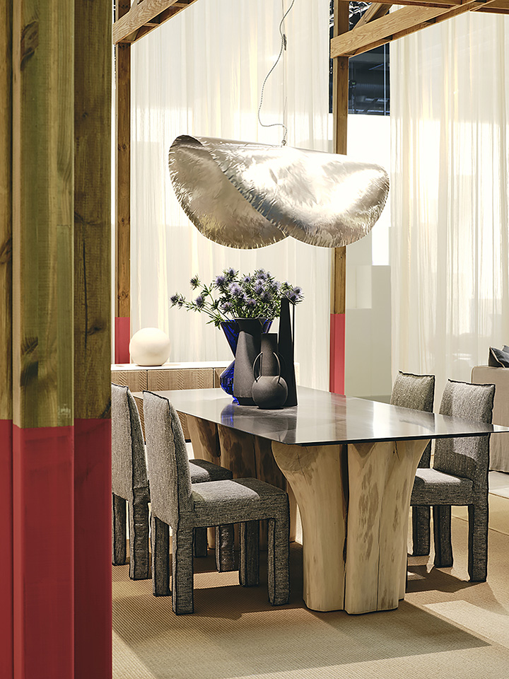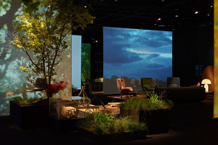 一昨年、昨年はホワイトカラーの柔らかいカーテンでスタンドを構成していましたが、今年スタンドのデザインを一新。ブラックベースのダークな空間で来場者の創造力をかきたてるような映像とともにプロダクトを展示し、「What makes the project of living? (暮らす”というプロジェクトとは ?)」をテーマにフレキシブルなライフスタイルを提案していました。高い注目を集めていたのが新作チェア Catifa Carta(画像右)。ブランドのアイコンとして愛されてきた Catifa 53 チェアを PaperShell (ペーパーシェル)という革新的なサステナブル素材を使用して刷新しました。29 枚の木質シートを層にして天然樹脂で接着したペーパーシェルは、CO2 を吸収するという樹木の特性を生かすことで環境に及ぼす影響を劇的に軽減しています。またユニークな2曲面シェルの構造により、強度と座り心地の良さを両立させています。