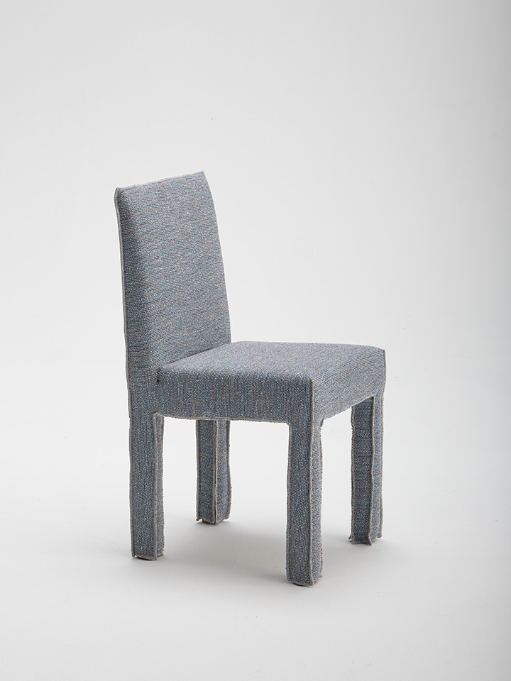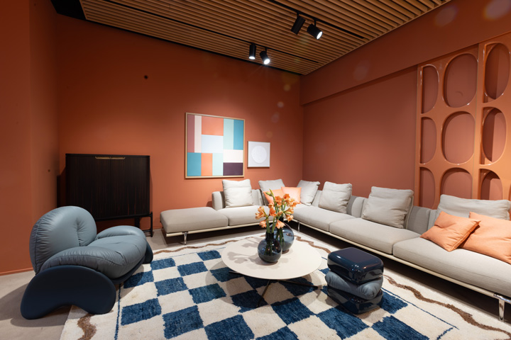 Poltrona FrauはManzoni通りのショールームで、IMAGINEをテーマに新作を発表しました。画像左はFAYE TOOGOODによるデザインの新作、SQUASH アームチェア、小型テーブル、ラグマットがコーディネートされています。イギリスのフォークソングの要素を再解釈し、1970年代らしさを融合したコレクションです。柔らかくふわっと包み込まれるような形状をしたアームチェアは見るからに最高の座り心地を想像できます。小型テーブルは ラッカー塗装された2つのウッドブロックが、クッションを挟み込んでいるユニークなデザインです。カラーバリエーションはクリーム、セージ、ブルー、ブラウンの4色です。ラグマットはイギリスのビンテージパッチワークのイスをイメージさせる市松模様が入っています。ベルベル族伝統の技法で天然由来の繊維と染料を使い、市松模様は手書きのペイント調を再現しています。