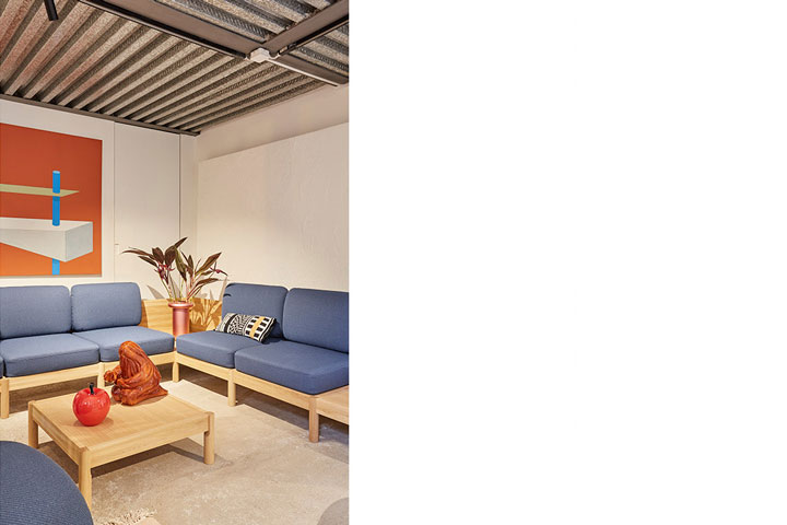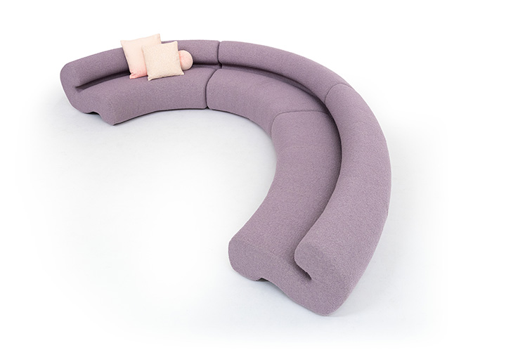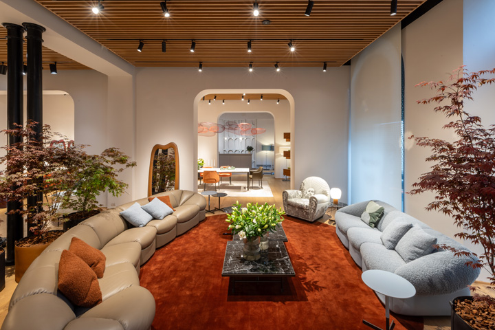 ミラノ市内、Via PontaccioにあるMorosoのフラッグシップストア。その中心部のセットアップの主役に選ばれたのはPatricia Urquiolaによるデザインのシーティングシステム Gruuve でした。70年代のNonconformistの美学を受け継いだこのデザインは、4つのモジュールを自由に組み合わせることでダイナミックな空間づくりを実現するほか、正面だけではなく背面にも簡単に座ることができる形状が取られています。家庭内、コマーシャルエリアどちらにおいても、人が出会ったり、くつろいだりといった、このソファを中心にインテリアで起きるさまざまな物語が頭に浮かんでくるようなデザインでした。