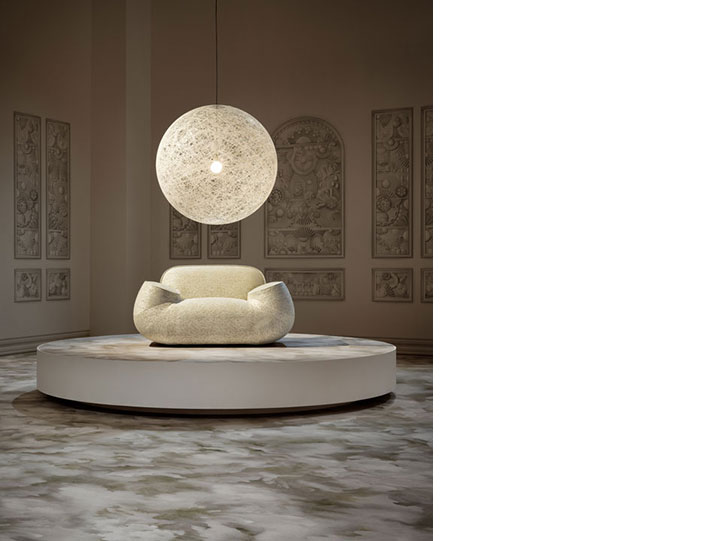 「A Life Extraordinary」をテーマに「リビングルーム」を単なる物理的な空間ではなく、デザインに生命(LIFE)を吹き込むというダイナミックなコンセプトでインスタレーションが開催されました。会場の中心では、円形のステージ上に家具と照明がそれぞれスタイリングされ、静的なプロダクトに、照明やマテリアルの質感、デザインの躍動感といった動の息吹が加わり、moooiの世界観を堪能できる唯一無二の魅力的な空間を作り上げていました。ホワイトやベージュといった明るいトーンで構成され、一見シンプルな装いにも見えますが、音に合わせてコントロールされた照明が空間を華やかに包み込み、さまざまなアプローチでゲストの五感を活性化させていました。画像右はアルゼンチンのデザイナーCristián Mohadedによる新作アームチェアのBIG GEORGE。ボリューム感があり、包み込まれるような形状が特徴です。そのほかLG Electronicsとのコラボレーション製品も展示され、moooiらしい遊び心のあるエレガントなデザインとテクノロジーが融合し、新たなインテリア空間を提案していました。