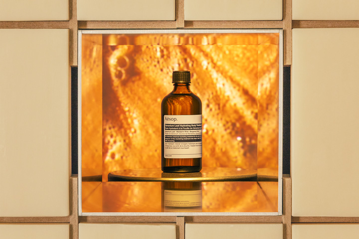 オーストラリアのスキンケアブランドであるAesopは、ミラノのPiazza Cordusioに新しいショップをオープンし、ミラノデザインウィークに初出展しました。ベルギーの建築家Nicolas Schuybroekによってデザインされたインスタレーションは、Form follows formulationをテーマに、1960年~1970年代のアルテ・ポーヴェラからインスピレーションを得ています。店内にはAesopのBar Soapを規則正しくグリッド状に構成した壁面が設えられ、Aesop製品の上質さや安心感といったブランドイメージを空間全体から感じることができました。またBar Soapの一部分を取り除くことで空洞が生まれ、Aesopの製品がその世界観を表現する映像とともに展示されました。このBar Soapはミラノデザインウィーク終了後、解体し再利用されるそうです。