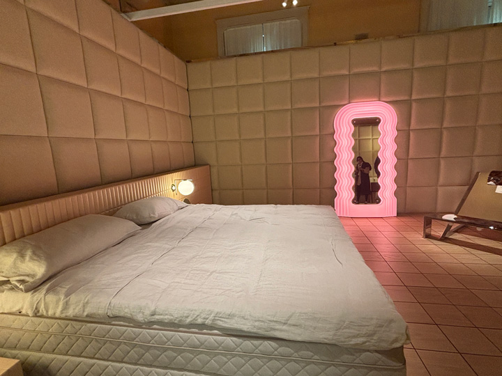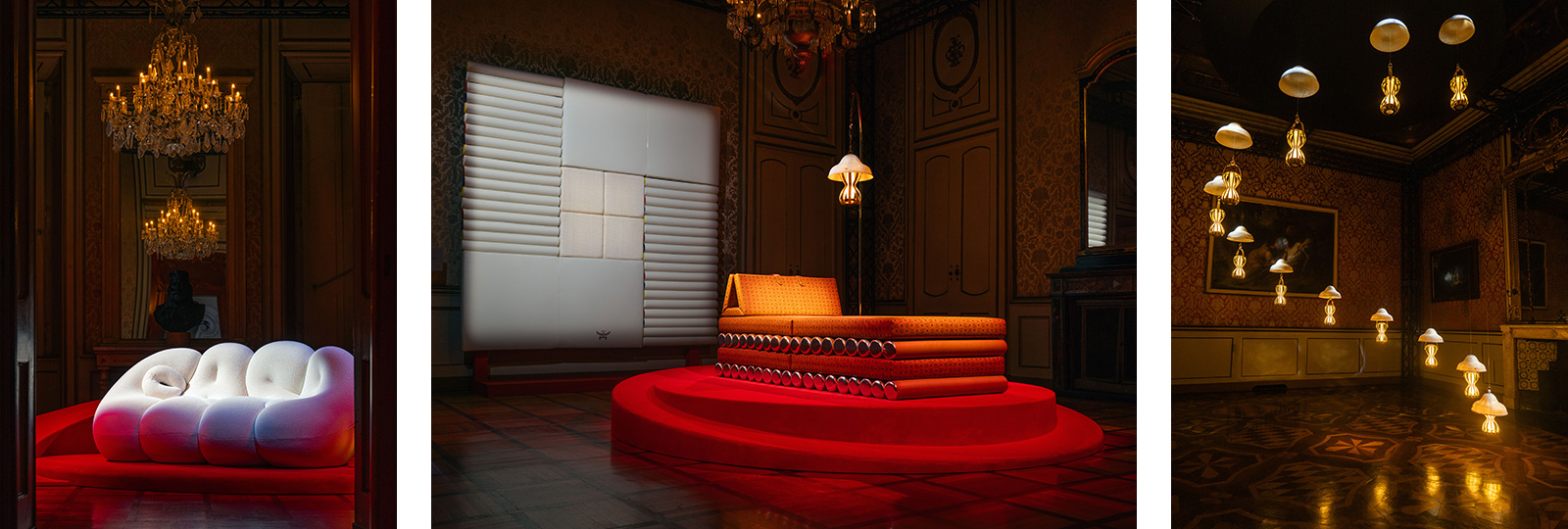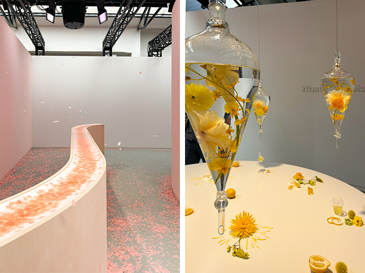 画像左はTamara Feldman DesignによるThe Bedroom 。デザイナーのルーツであるメキシコの伝統や美学を表現し、テラコッタや木材といった温かみを感じる自然素材を複雑に融合させています。画像中央と右はStudio Meshary AlNassarによるThe Flower Room 。 フランスのシュルレアリスムからインスピレーションを得たデザインで、ベビーピンクやベビーブルーなどのパステルカラーを使用しています。ゲストが中庭に足を踏み入れる前に、柔らかな色調に囲まれたこの部屋で気ままなひと時を過ごしてもらうことを意図しています。それぞれの部屋でマテリアルとインテリアの複雑でハイレベルなコーディネートを提案し、魅惑的な音楽の演出とともに唯一無二のインテリア空間を作り上げていたArtemestは、今年のデザインウィークの中でも強いインパクトを残したインスタレーションの一つでした。