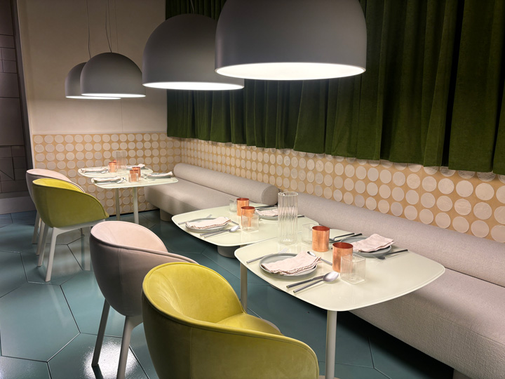 画像左はベッドルームのSoffice。イタリア語でふわふわした様を表すこのタイトルの通り、柔らかな質感を視覚的にも感じるマテリアルでまとめられたベッドルームは、吸音機能をもつフェルト製の壁面で囲まれています。一方で、硬質な印象を持つフロアのタイルや個性的なデザインのアームチェアMies。印象的なライト付きのミラーは、1970年にデザインされたUltrafragolaで、空間全体が優しい印象であると同時に、どこか懐かしさを感じるようなレトロな風合いを感じます。画像右はレストランエリアのCromie。Elisa Ossino がデザインしたNINEFIFTYの新作のタイルが壁面とフロアに使われています。家具はRUBELLIやKartellの製品がコーディネートされ、色とパターンを視覚的に楽しめる空間でした。