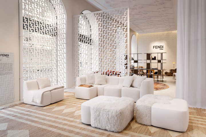 ミラノ市内にあるFENDI Casaのショールームでは、デザインスタジオControventoによる、 FFロゴをモチーフとしたシースルーのパーテーションや、白を基調としたミニマルで優しい世界観のセットアップの中、新作が発表されました。コンテンポラリ-アートギャラリーの世界観にインスピレーションを受けたというこの空間では、パーテーションによってエクステリアからインテリアへと誘導された導線で新製品のデザインが焦点を当てられます。その中で展示されていたのが同じくControventoによるソファ “FENDI F-Affair”。異なるテクスチャのFFロゴをモチーフとした形状の組み合わせによって構成され、空間演出から連動するコンテンポラリーな様式と快適な座りごごちが調和するデザインです。