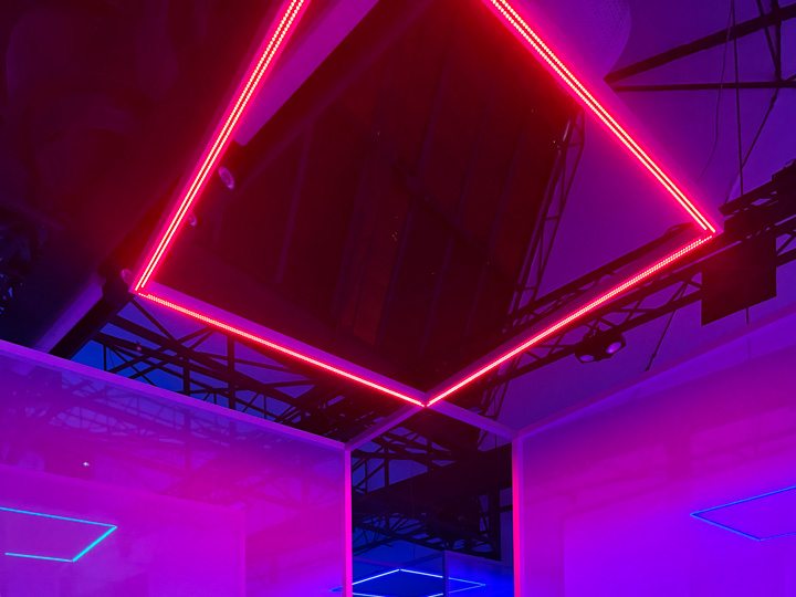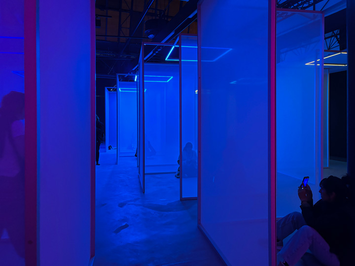 まずは、スクリーンによって21個に区切られた空間の中で、座ったり歩いたりしながら音と照明によるインスタレーションを体感します。Chromasonicの技術により音の周波数を光に、光の周波数を音に変換したもので、視覚と聴覚の感覚が交差するのを感じます。