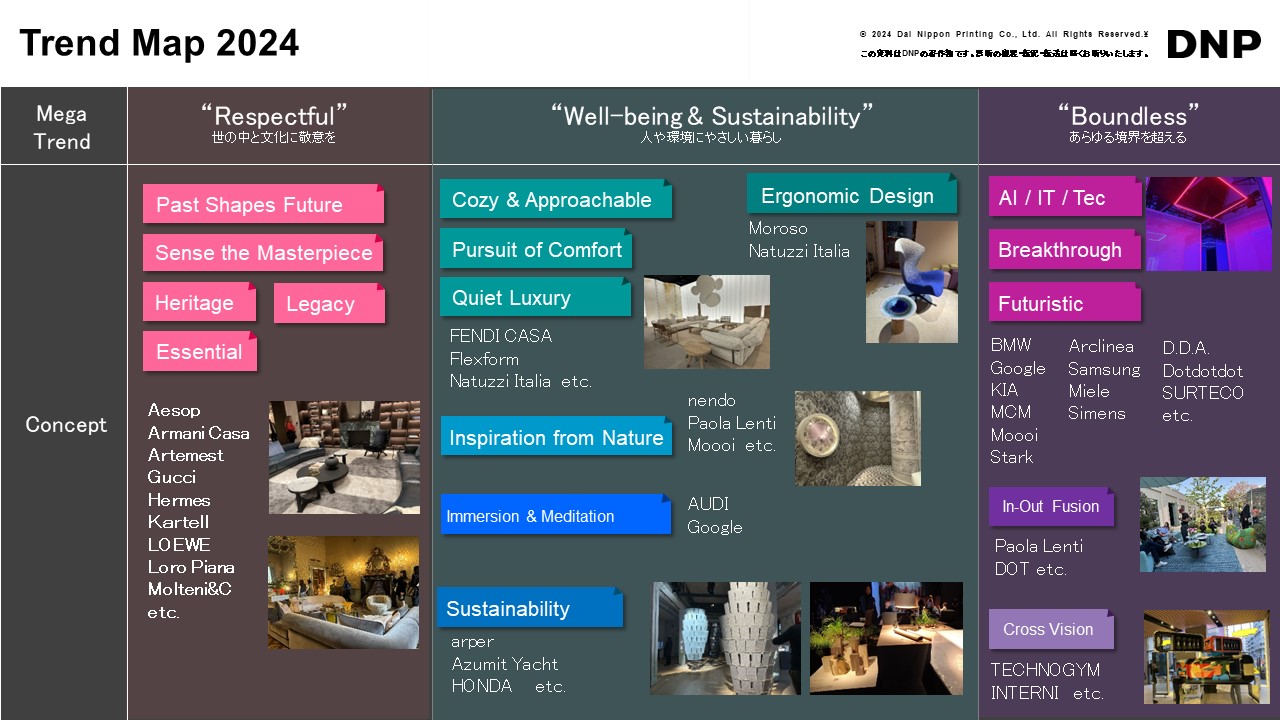 DNPでは、今年も3つのメガトレンド(数年間は続く社会的傾向)をベースに、各ブランドの出展コンセプトを分析しました。これらの方向性は、世界的なライフスタイルのトレンドを把握する上で重要な背景になると考えています。