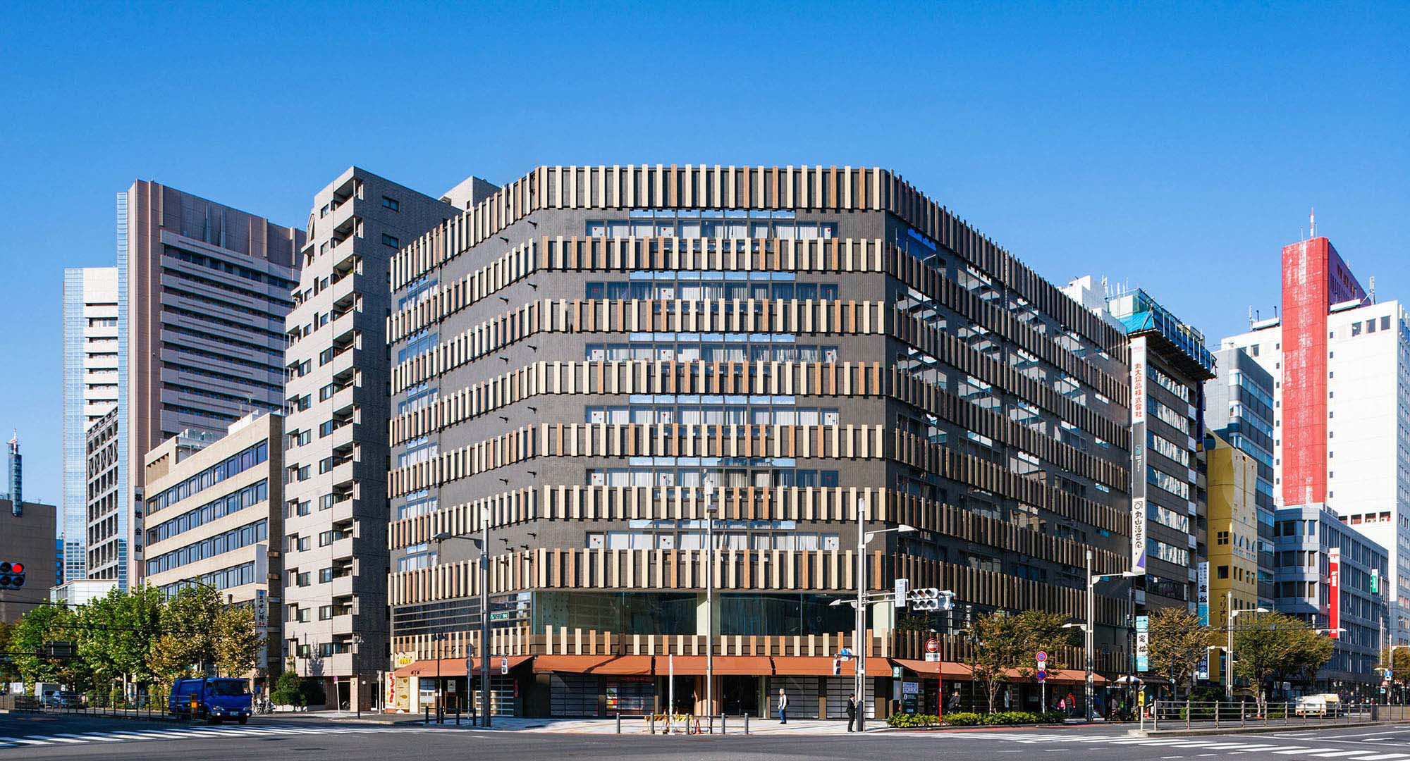 旧築地市場の向かいに建つ複合ビル・築地KYビル は、外壁に木目調のアートテックをあしらい、築地らしいにぎわいのある温かな姿へとリノベーションしました。