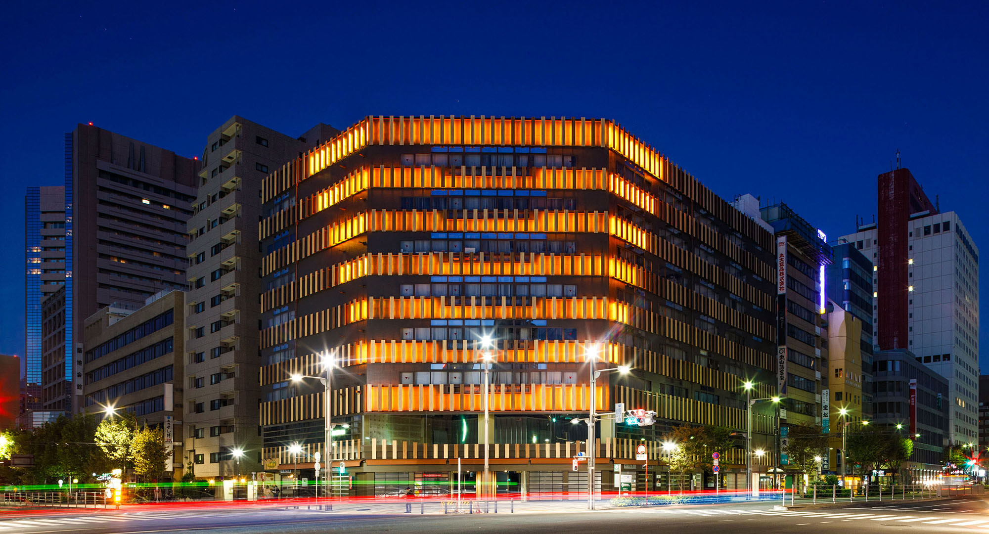 既存建物の解体後、外壁4面にアートテックを713枚設置しました。それにより、横連窓の単調なファサードを一新し、かつての下町の木造建築が持つスケール感や質感を取り戻しています。夜間には、パネルの隙間から温かい光が漏れ出て、行灯のような効果を生み出しています。