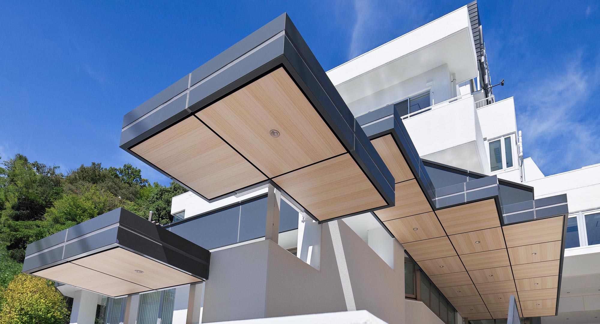 使用したのは、3つの色を使った木目柄のアートテックです。外壁パネルから浮かせたルーバーを全面に配置するなど、細部のデザインにも工夫が施されている点が特徴的です。