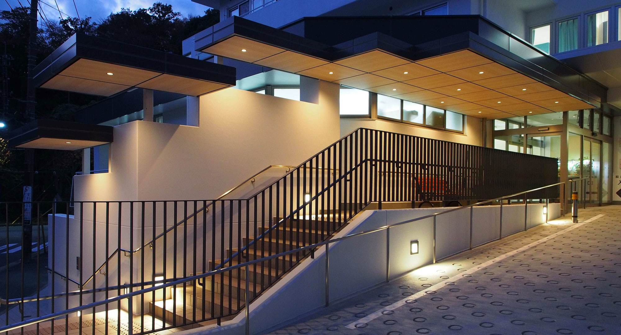 昼は白木のように見える木目調アートテックが、夜はライティングによりあたたかみのある雰囲気に変化します。アプローチの安全を確保するとともに、デザイン面でも効果的な工夫が施されています。