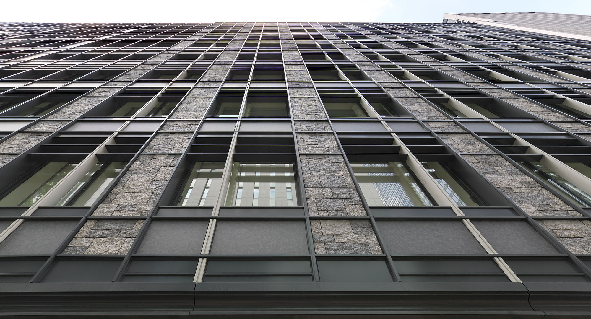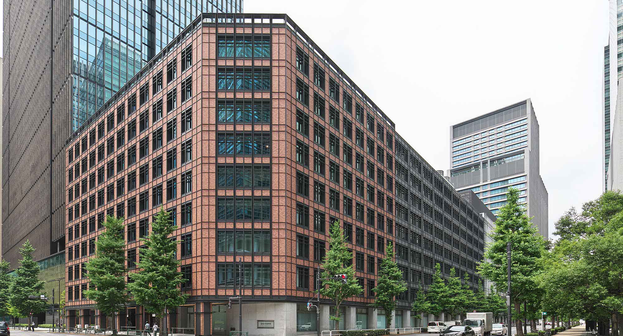 大手町ビルは、街並みに合わせて、東西で異なるテーマを持っています。大名小路に面する東側は、東京駅や三菱一号館美術館にも用いられている「レンガ」がモチーフです。一方、日比谷通りに面する西側は、皇居のお堀や二重橋などを想起させる「石垣」をモチーフにしています。