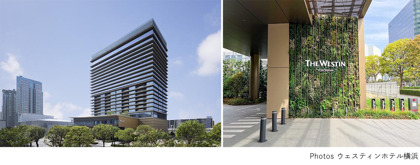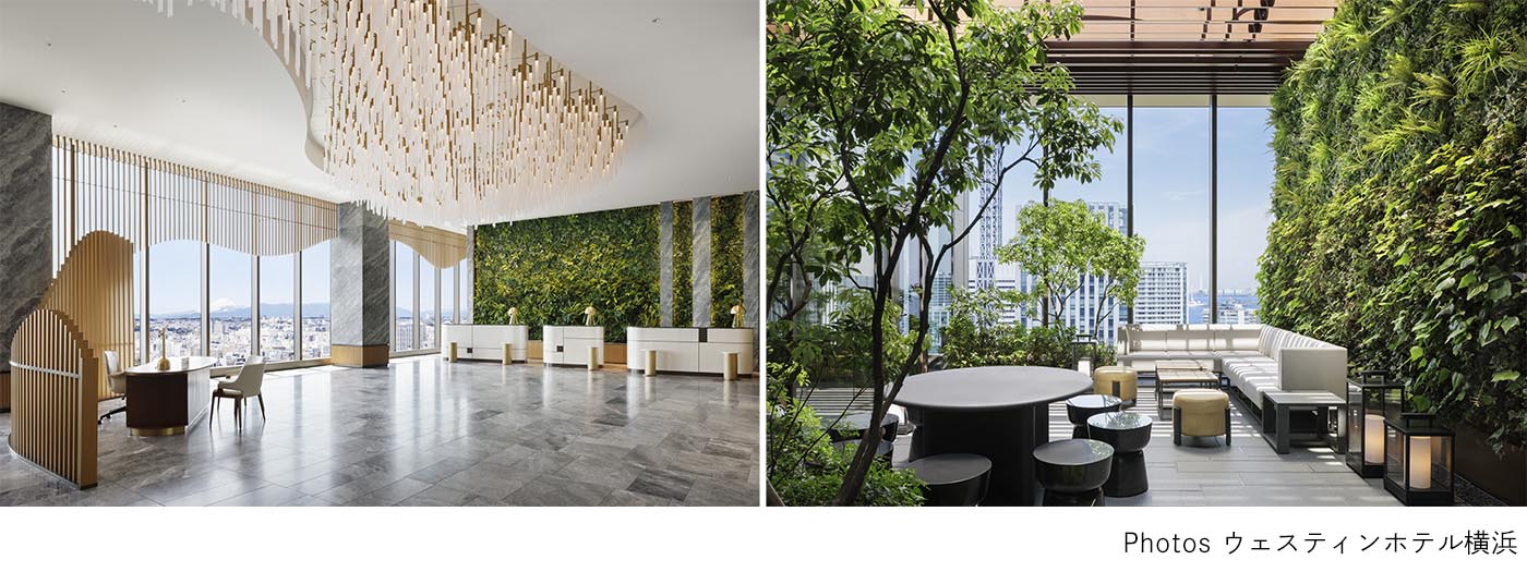 ホテルの外観は「風にたなびく帆船」をイメージしたデザインです。庇の層が一つずつ積み重なっていく様が美しく、横浜の空に向かって優雅にそして力強く航海をしているようなシーンを想起させる景観でした。庇の生み出す深い陰影は、表情豊かな外観をつくるとともに、内部に柔らかく光を取り込むことで、“ウェルビーイングなホテル”というコンセプトを体現しているそうです。またホテルのエントランスではグリーンウォールがゲストを迎えます。ホテルのコンセプトの一つである「コネクション」から、自然とのつながりを感じられる場所となっています。