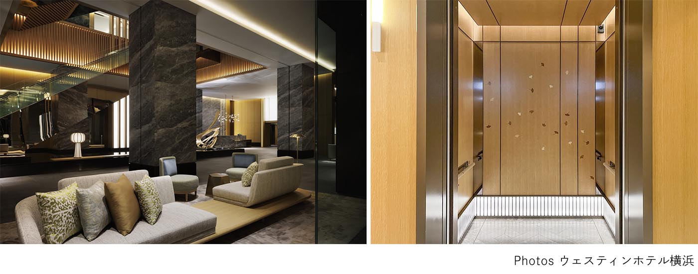 ホテルの1階エントランスに入ると、凛とした静寂につつまれたロビーが広がります。水盤に浮かんでいるオブジェ「Voyage」は、広い海へと航海に旅立つような姿をイメージしているそうです。そのほか灯篭を想起させる照明など、和の要素を感じるモダンな空間でした。リラックス感を促す自然の要素と、港町横浜を連想させるシャープで重厚な鋼と金属の要素を共存させているそうです。エレベーターホールの壁面には銀杏の葉が象嵌細工で表現されていました。ホテルから海に向かって一直線に伸びる「いちょう通り」から由来しています。