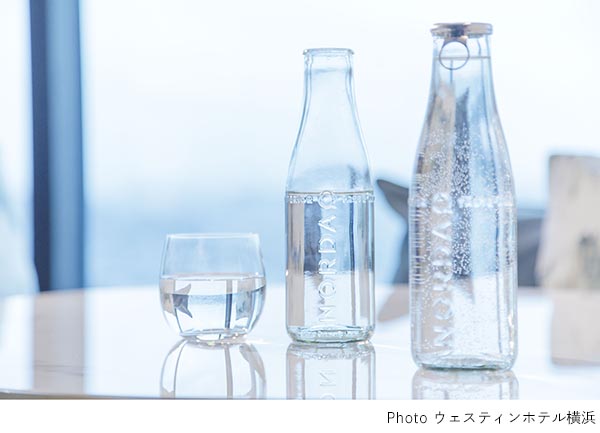 ウェスティンホテル横浜では、消費エネルギーを極力抑えるべく、全ての客室の温度を検知し、使用電力を必要最低レベルに管理する最新型のセンサーを導入しています。客室内の照明は調光が可能で、時間帯や過ごし方に合わせて照明を調整できるだけでなく、省エネにも貢献しています。またペットボトルを最大限に排除し、世界で最もサステナブルなノルダック・プレミアムウォーターを館内でリサイクルボトルに瓶詰し提供しています。さまざまな視点からウェルビーイング、サステナビリティに取り組んでいることを感じることができました。