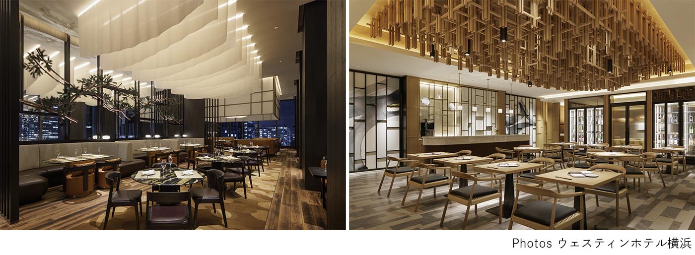 画像左は23階に位置しているシグネチャーレストラン「アイアン・ベイ」です。長年、鋼鉄の貿易港として栄えた横浜港に由来したこのレストランでは、炎・煙・炭をテーマとしたグリル料理を提供しています。画像右は3階に位置している日本料理のオールデイダイニング 喫水線です。店内の天井には、横浜港にとって主要輸出品であった生糸の織り機をイメージした木組が施されています。五感で横浜らしさを感じながらEat Wellを体験できる場所となっています。