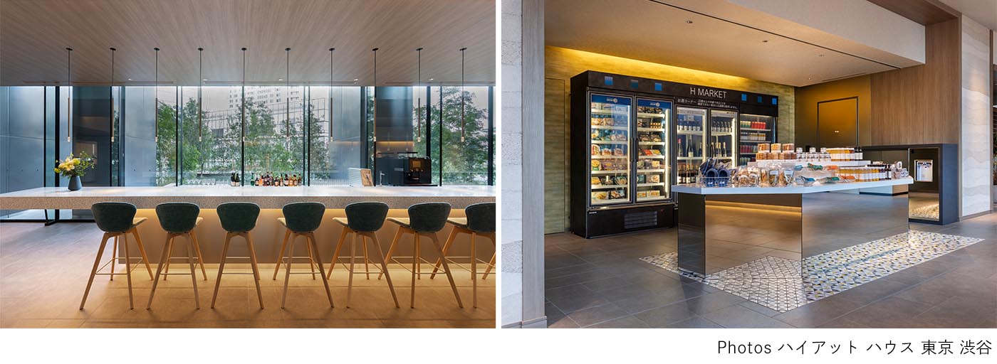画像左はHバー、画像右は24時間営業のHマーケットです。このマーケットでは、お菓子や飲み物、渋谷にちなんだ商品など地域の個性を感じられる商品を取り揃えています。冷凍食品も幅広く取り扱っていて、客室のオーブンレンジで調理することが可能です。また渋谷にある人気のインテリアショップ「Gallery1950」とのコラボレーションによるハイアット ハウス のオリジナル のウォッシャブルスリッパなども販売されています。