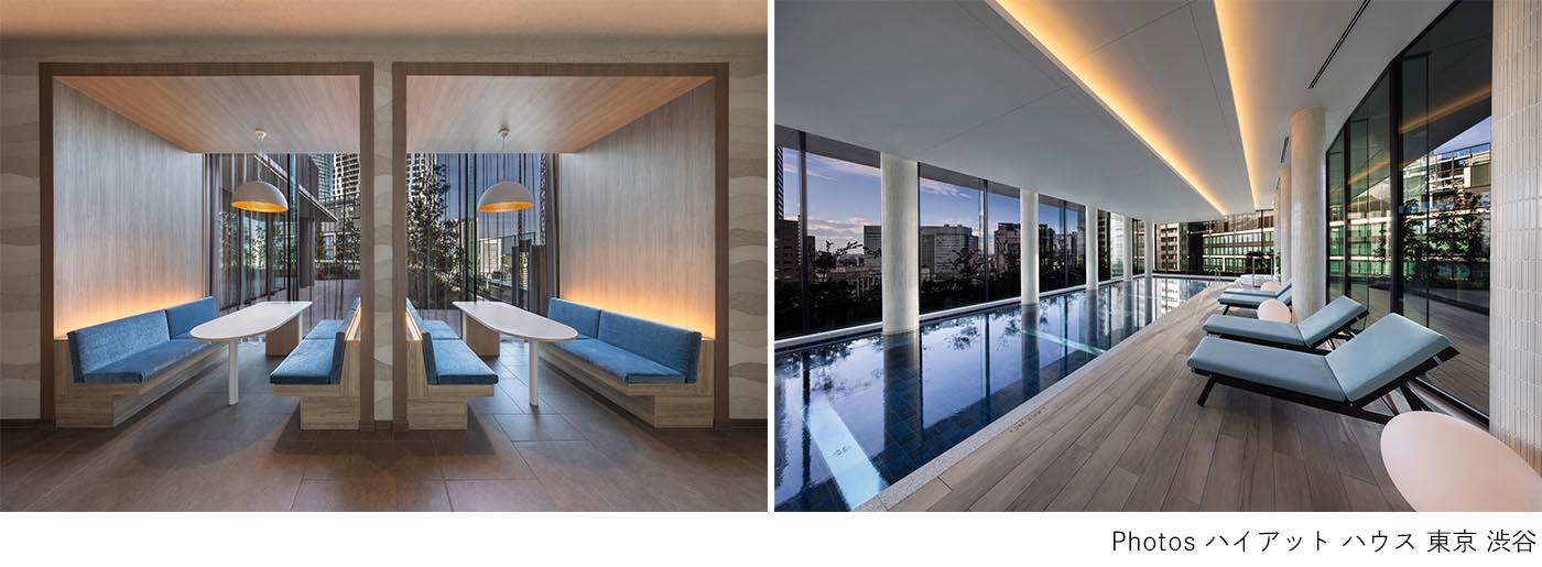 画像左は22階に設けられたクラブラウンジです。上質な家具に囲まれた空間で、ドリンクや軽食を楽しみながらEat Wellが体験できる場所です。画像右は屋内プールです。5階のウェルネスフロアには屋内プールのほか、ジム、サウナ、スパが完備されています。プールエリアは外気浴ができるテラスにもつながっています。まさしくMove Well & Feel Wellを体感できる場所となっていました。