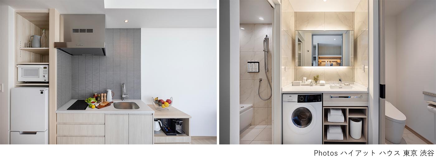 各客室には調理器具や食器が揃ったキッチンが完備され、自分好みの料理を自宅にいるかのように楽しむことができます。ドラム式洗濯乾燥機は、滞在中に自室で洗濯・乾燥まで行うことが可能です。コンパクトでありながら、長期滞在も自分の自宅のように快適に過ごすことができる機能が充実しています。1カ月以上の長期滞在のゲストは愛犬(10kg以下の小型犬)と一緒にホテルステイも可能だそうです。
