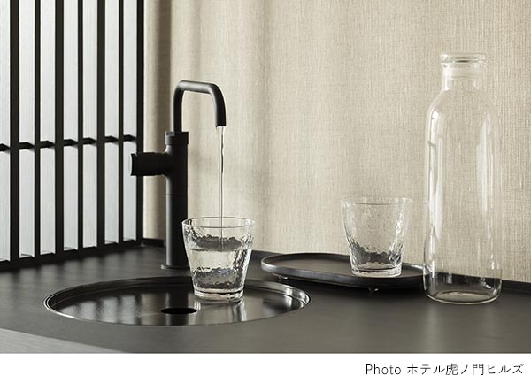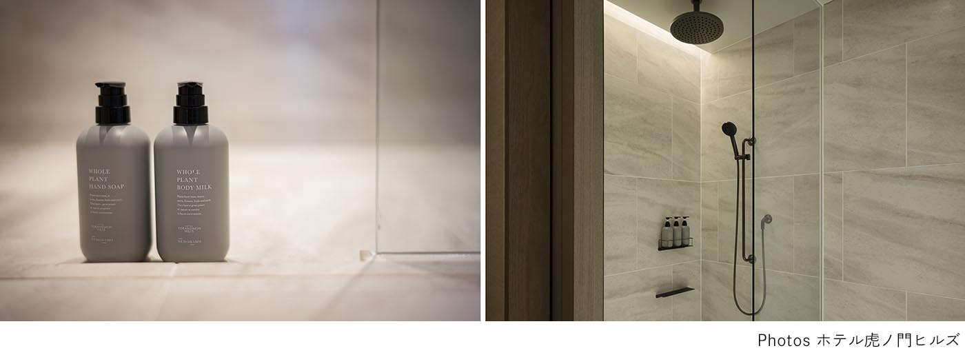 環境に配慮したホテルとして、飲料水を提供する浄水器専用の水栓を全室に完備しています。館内では積極的にリサイクルに取り組み、バスアメニティにはオーガニックの国産ブランドNEMOHAMOを使用しています。また、虎ノ門ヒルズの街区に導入されたエネルギーセンターからの効率の高いエネルギー活用に加え、ホテルを含む建物全体で使用される電力は全て「RE100」に対応した再生可能エネルギーを使用しているそうです。